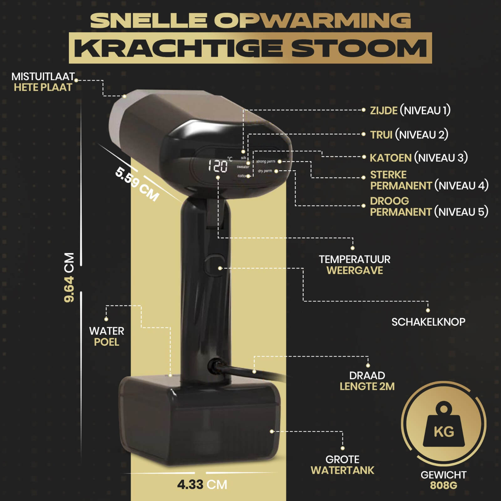 Met een gewicht van slechts 0,81 kg, een waterreservoir van 0,33 L, een snoerlengte van 2 meter en functies zoals automatische uitschakeling, is hij handig in gebruik én veilig. Ideaal ook voor onderweg of kleine ruimtes